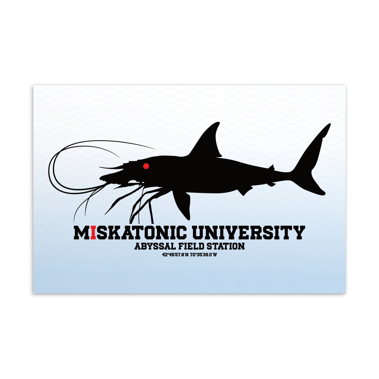 Ein markantes Emblem, das einen Hybriden mit Haikörper und Garnelenkopf mit akademischem Schriftzug für die Abyssal Field Station der Miskatonic University kombiniert. Die Grafik wirkt wie das Siegel einer akademischen Feldstation mit beunruhigenden maritimen Anklängen und verbindet wissenschaftliche Autorität mit unheimlichen Tiefseebildern. Ideal für Branding, Abzeichen oder thematische Sammlungen rund um die Innsmouth-Geschichte.