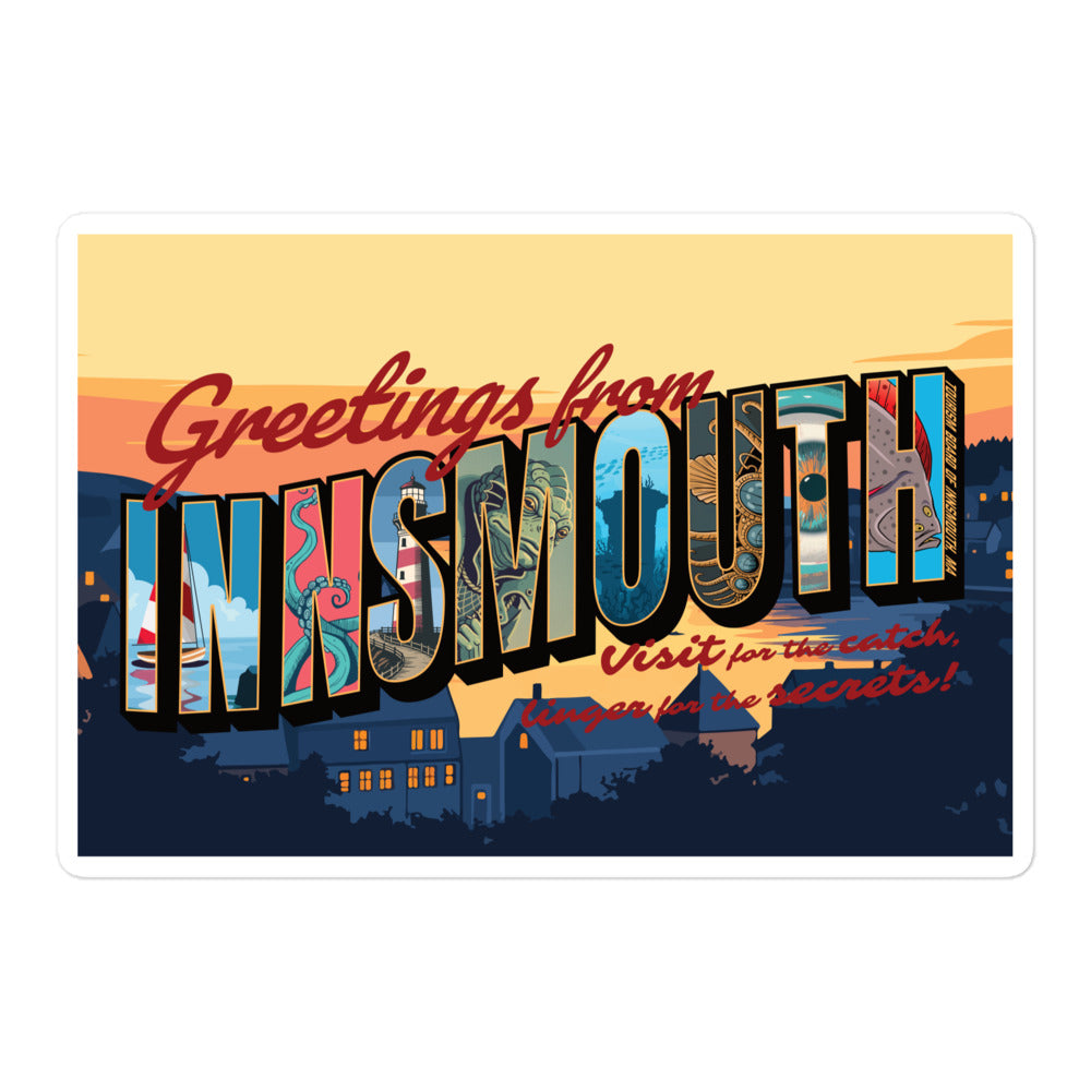 A large‑format "Greetings from Innsmouth" travel‑poster featuring retro letter‑inlay scenes of coastlines, lighthouses and fishing life with subtle, unsettling Lovecraftian motifs. Flat colors, strong silhouettes and halftone textures evoke a nostalgic vintage postcard aesthetic. The design marries classic seaside tourism imagery with an undercurrent of uncanny maritime menace.