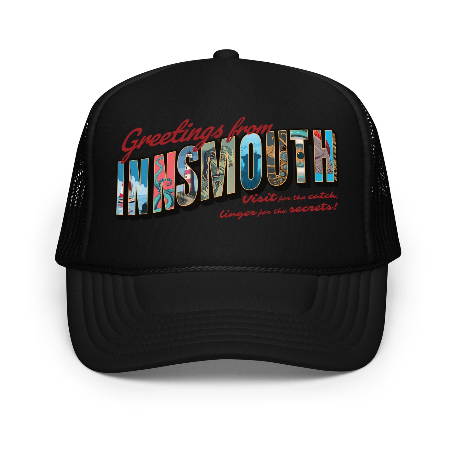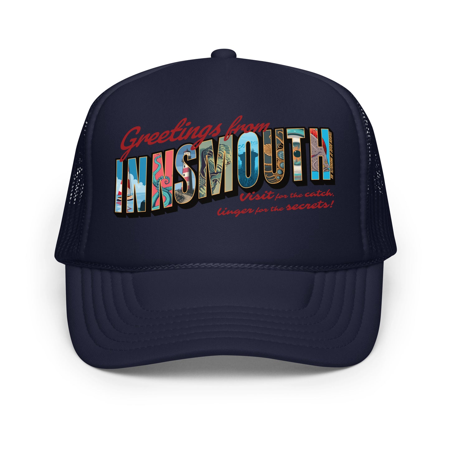 A large‑format "Greetings from Innsmouth" travel‑poster featuring retro letter‑inlay scenes of coastlines, lighthouses and fishing life with subtle, unsettling Lovecraftian motifs. Flat colors, strong silhouettes and halftone textures evoke a nostalgic vintage postcard aesthetic. The design marries classic seaside tourism imagery with an undercurrent of uncanny maritime menace.